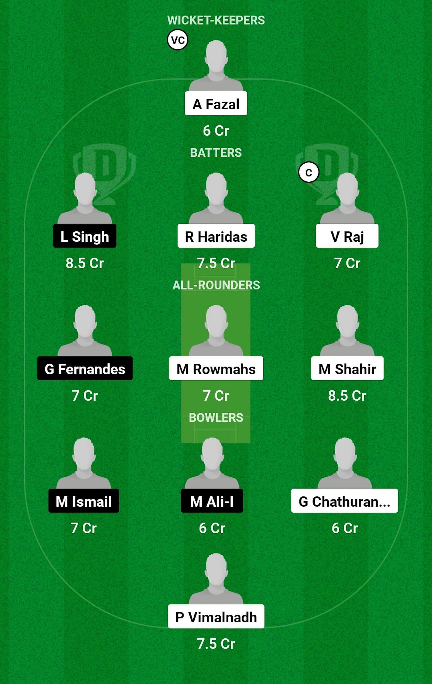 Aquib Fazal, Mohammed Hafeef (wk), Hareesh Haridas, Ranjith Haridas (c), Ahmed Farzeen, Mohammed Rowmahs, PV Vimalnadh, Gihan Chathuranga, Akif Nalakam, Mohammed Nadim, and Vishnu Raj.