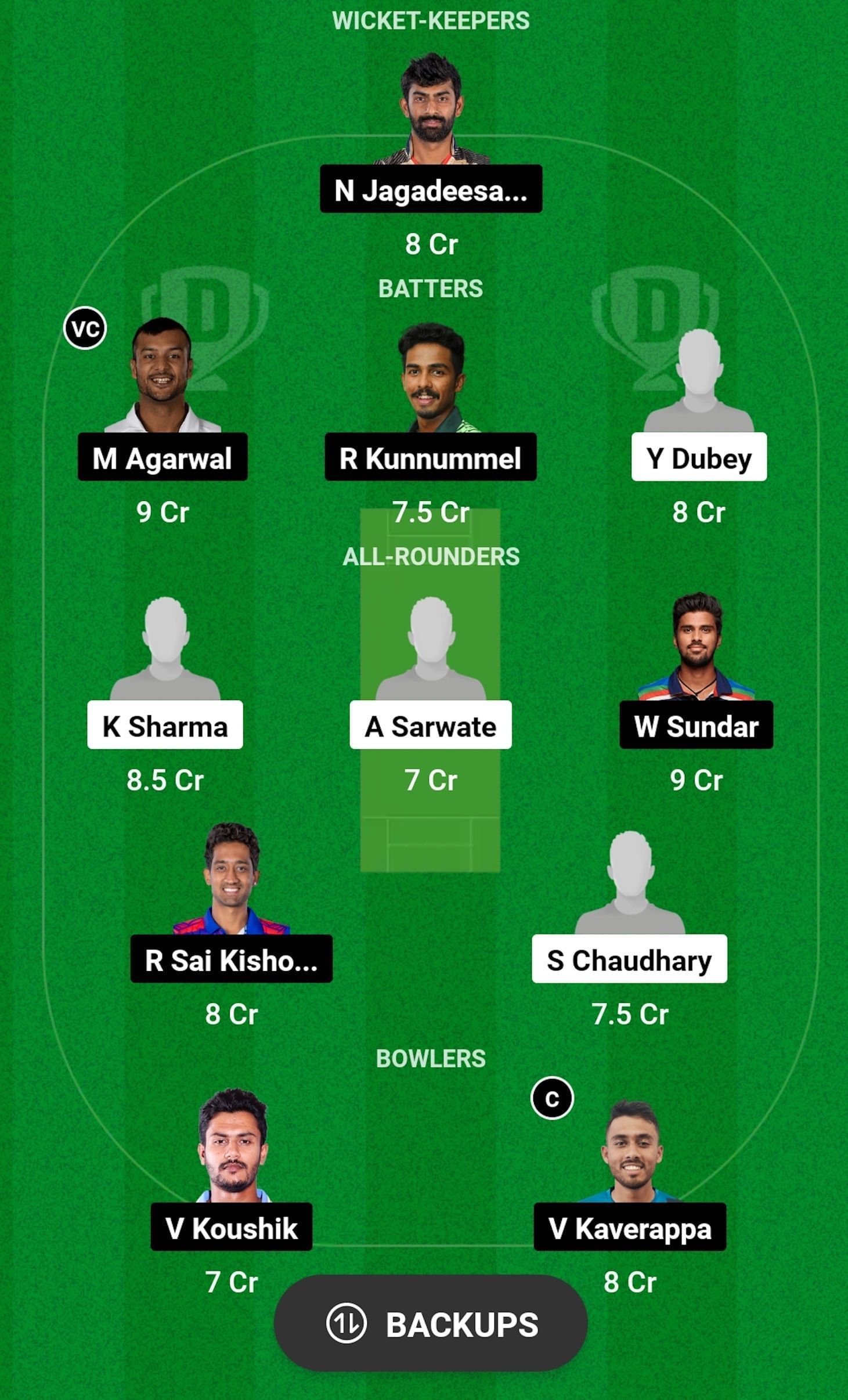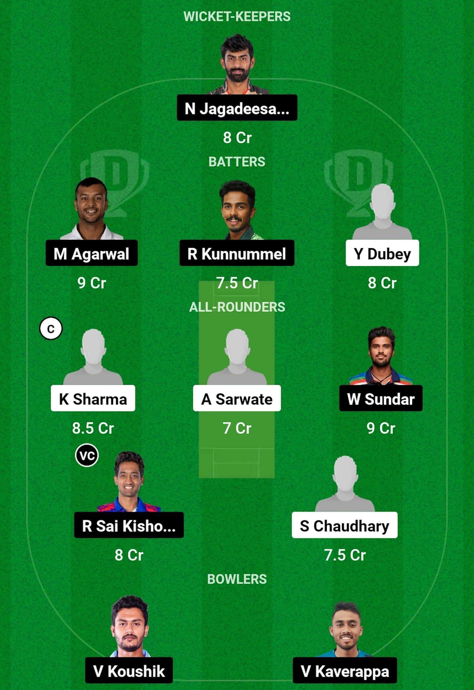 Rohan Kunnummal, Mayank Agarwal (c), B Sai Sudharshan, Narayan Jagadeesan (wk), K Rohit Rayudu, Arun Karthik, Washington Sundar, Vashuki Koushik, R Sai Kishore, Vyshak Vijaykumar, and Vidwath Kaverappa.