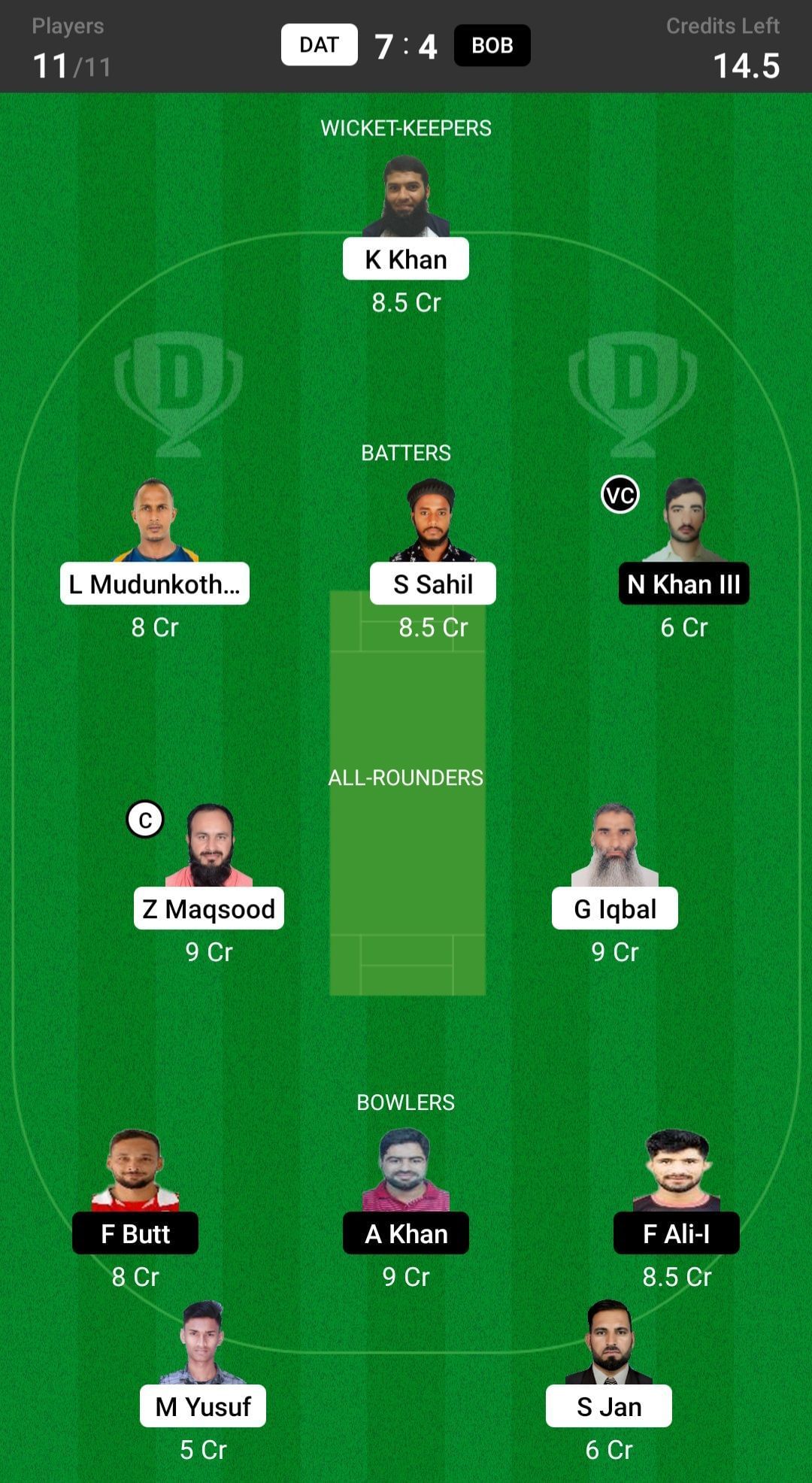 Z Maqsood will bat in the middle order and also complete his quota of overs, making him the safest pick for the captaincy. He is expected to play a crucial innings in today's match. He has smashed 24 runs and taken 5 wickets in the last three matches.
