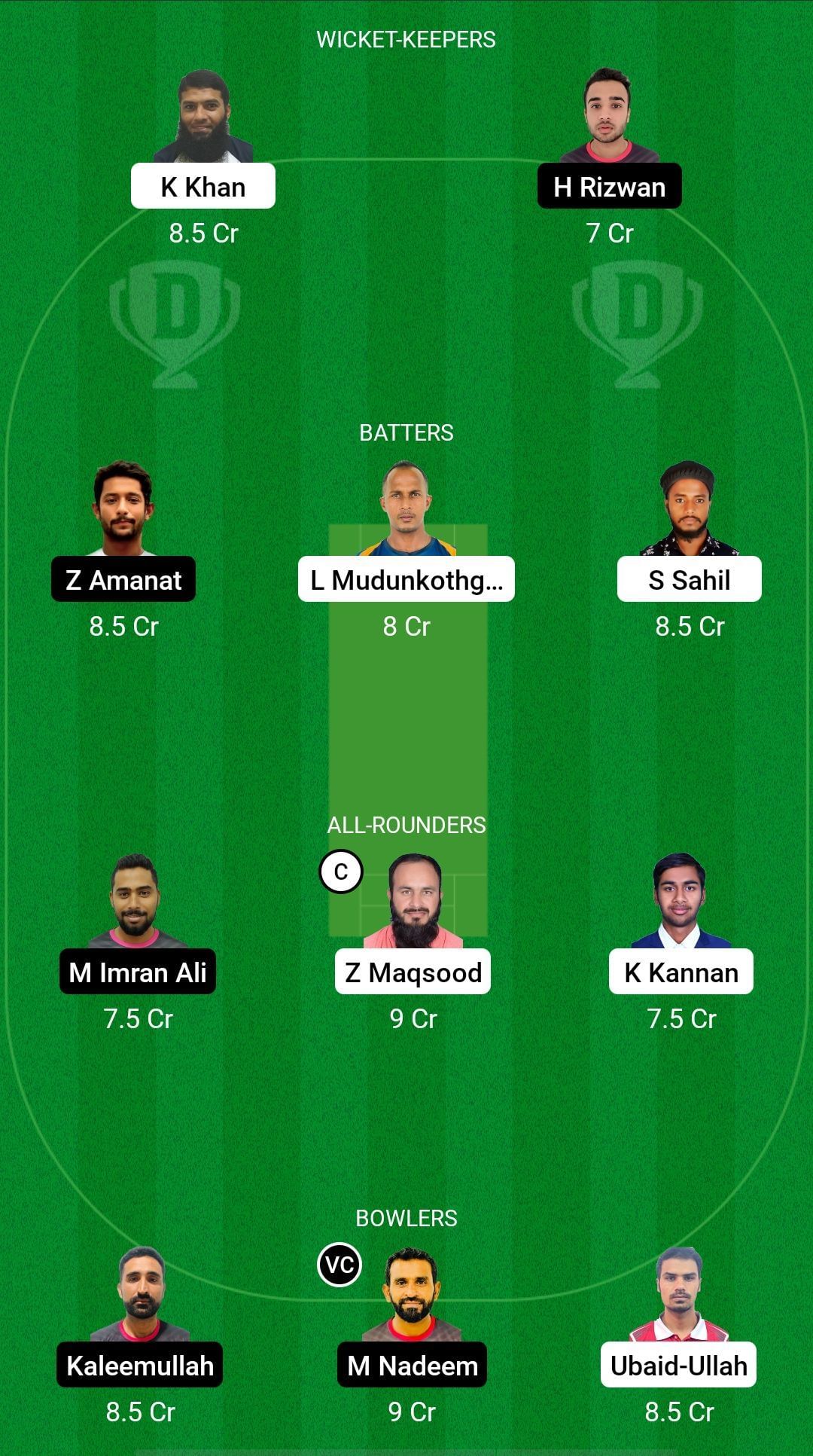 Ravindra Karunaratne (C), MD Yusuf, Rahil Habibullah (WK), Afzal Khan, Ghazanfar Iqbal, Shafiq Jan, Karan Kannan, Khurram Nawaz, Shaik Sahil, Ubaid Ullah, Zeeshan Maqsood