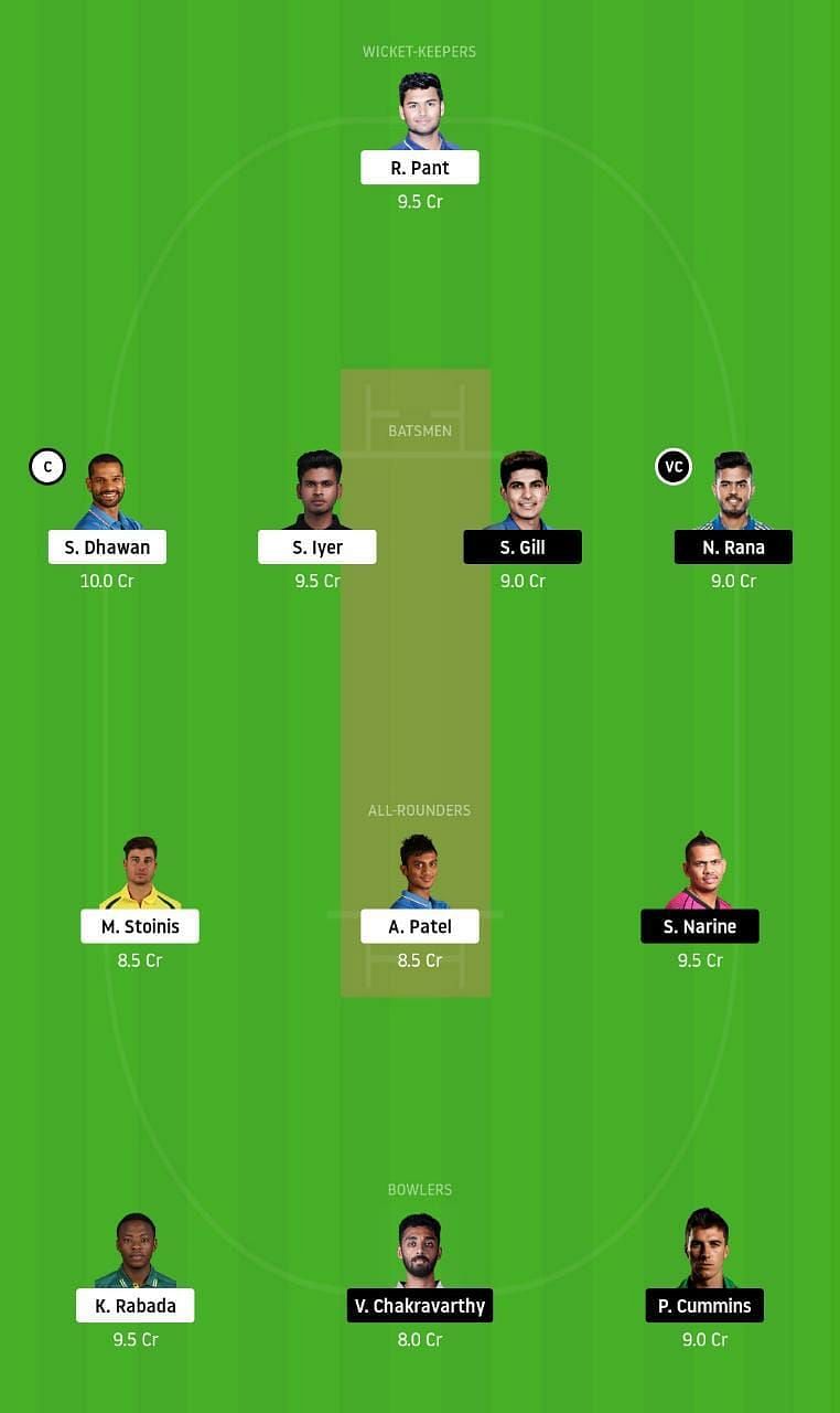 Fantasy Suggestion #1: Rishabh Pant, Shikhar Dhawan, Shreyas Iyer, Shubman Gill, Nitish Rana, Marcus Stoinis, Axar Patel, Sunil Narine, Kagiso Rabada, Varun Chakravarthy and Pat Cummins