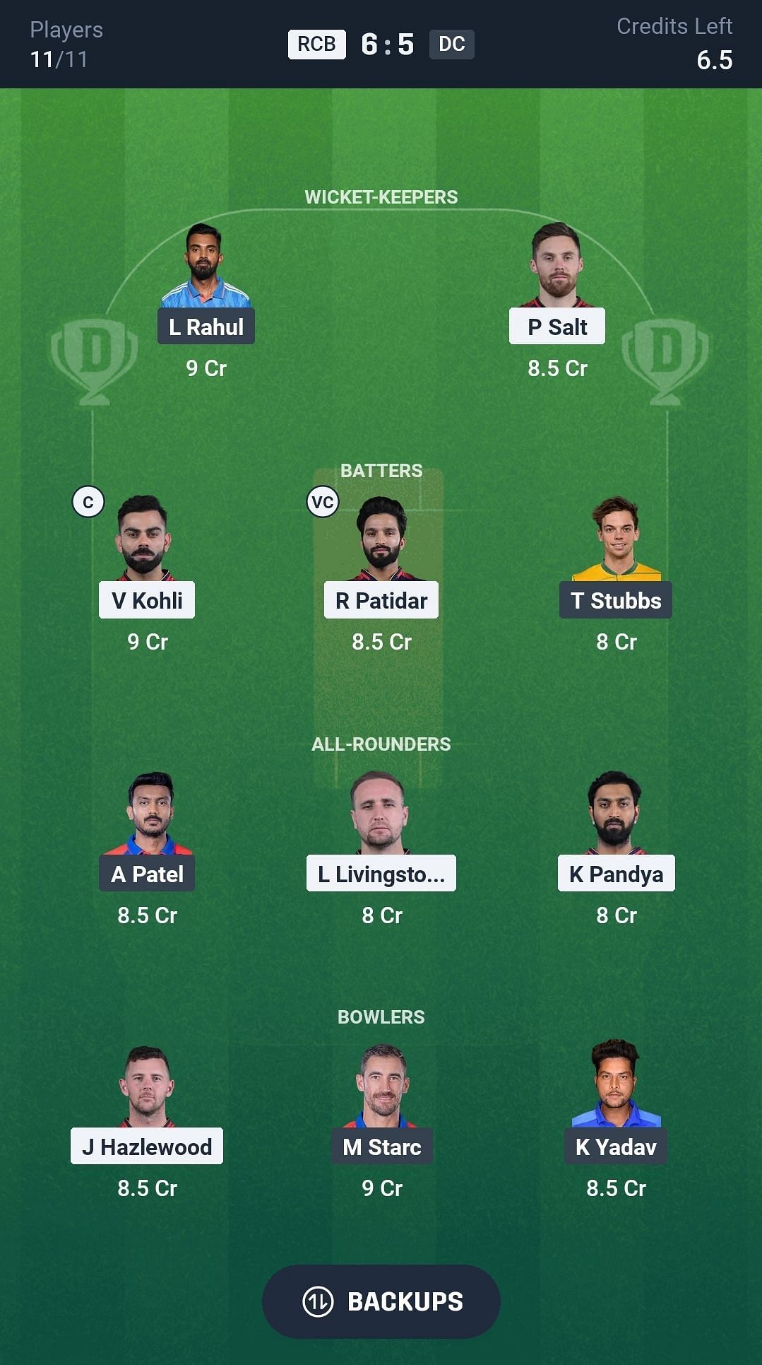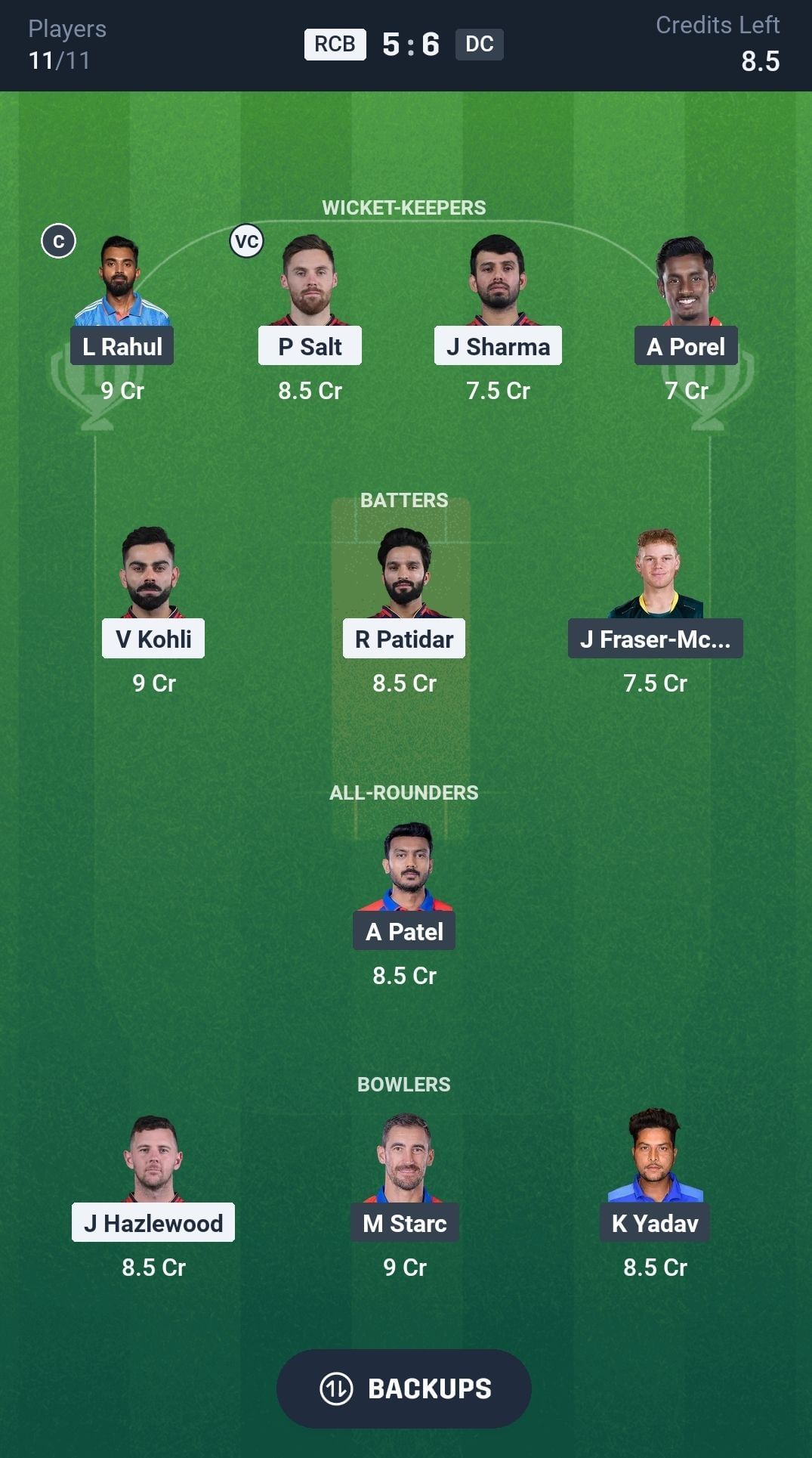 Batters: V Kohli, R Patidar, J Fraser McGurk