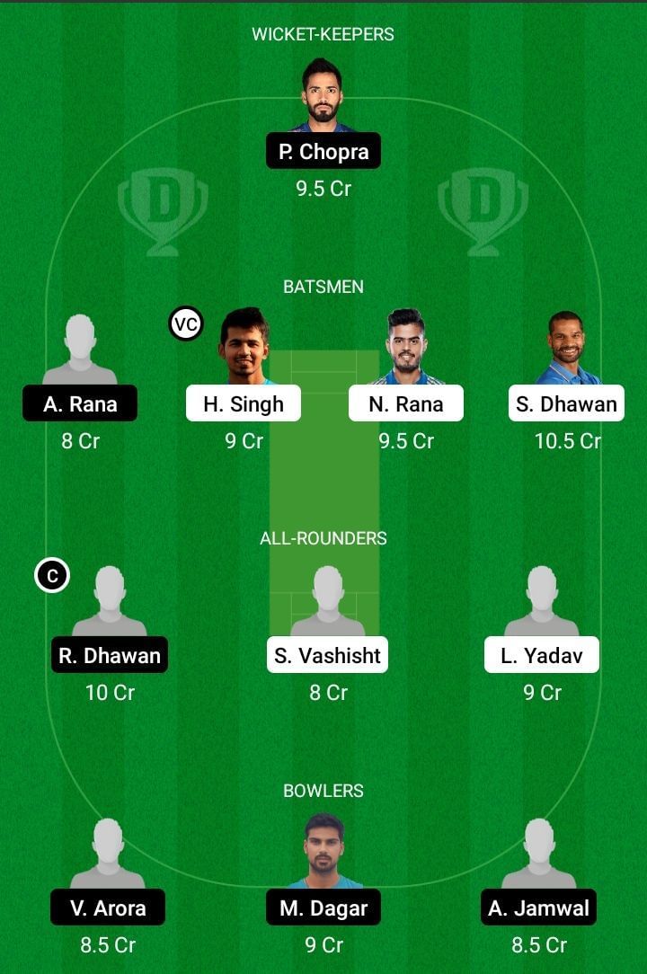 Fantasy Suggestion #1: Prashant Chopra, Nitish Rana, Shikhar Dhawan, Himmat Singh, Abhimanyu Rana, Rishi Dhawan, Lalit Yadav, Shivank Vashisht, Vaibhav Arora, Ayush Jamwal, Mayank Dagar.