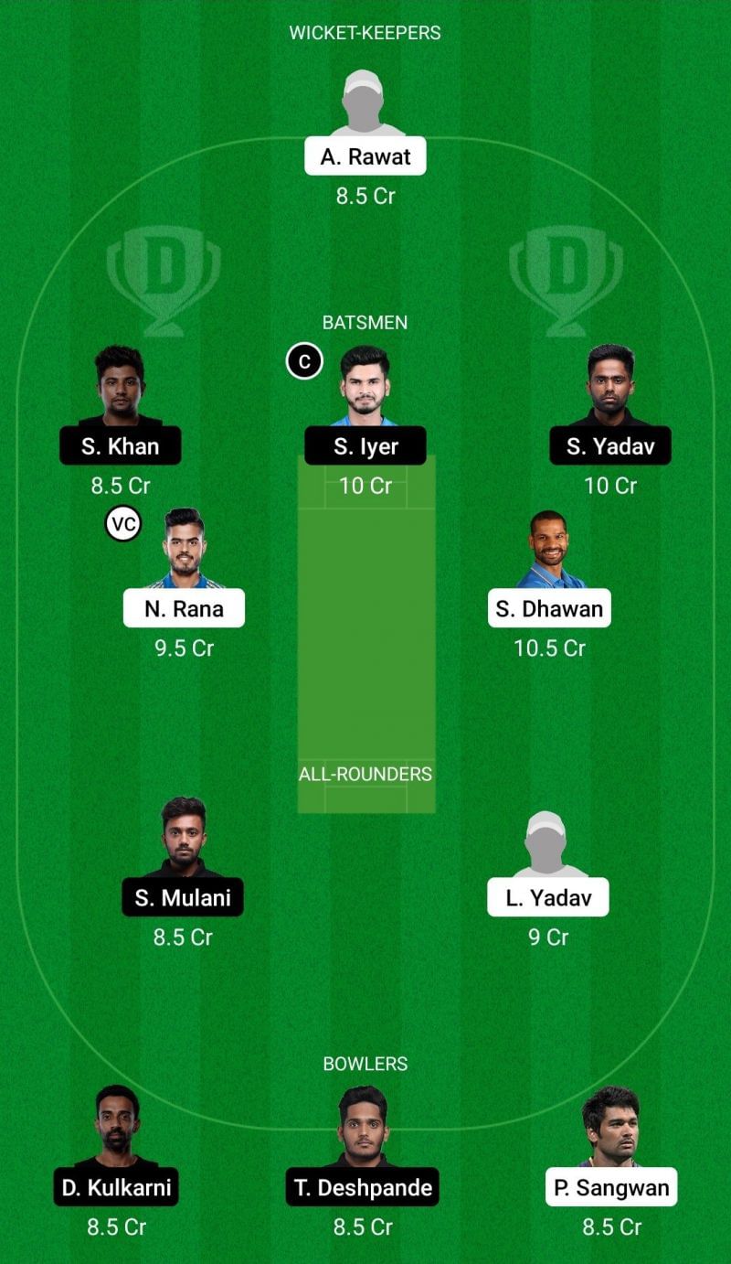 Fantasy Suggestion #1: Anuj Rawat, Sarfaraz Khan, Shreyas Iyer, Suryakumar Yadav, Nitish Rana, Shikhar Dhawan, Shams Mulani, Lalit Yadav, Dhawal Kulkarni, Tushar Deshpande, Pradeep Sangwan