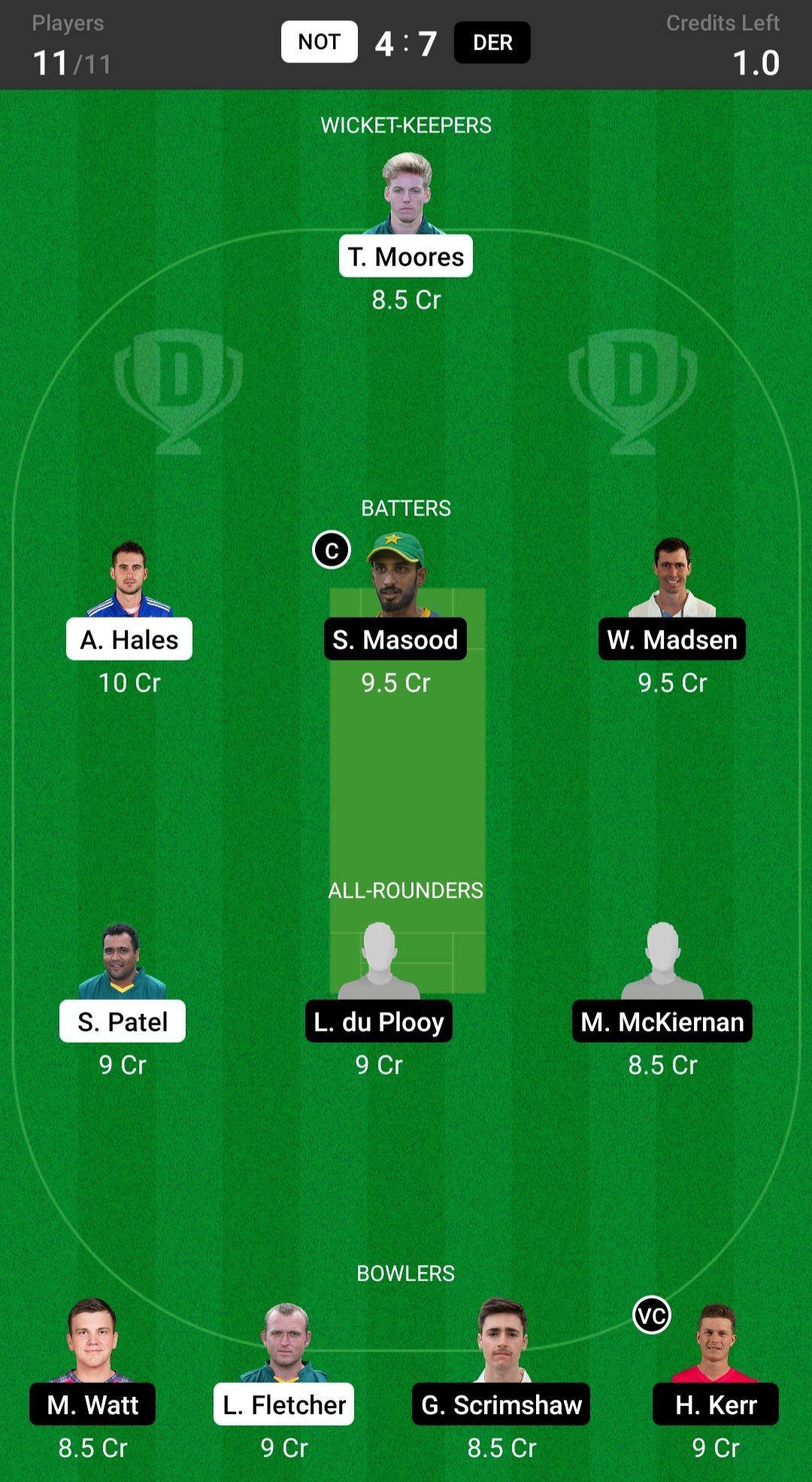 Fantasy suggestion #1: T Moores, A Hales, W Madsen, S Masood, D Christian, L Du Plooy, S Patel, M McKiernan, M Watt, H Kerr, G Scrimshaw
