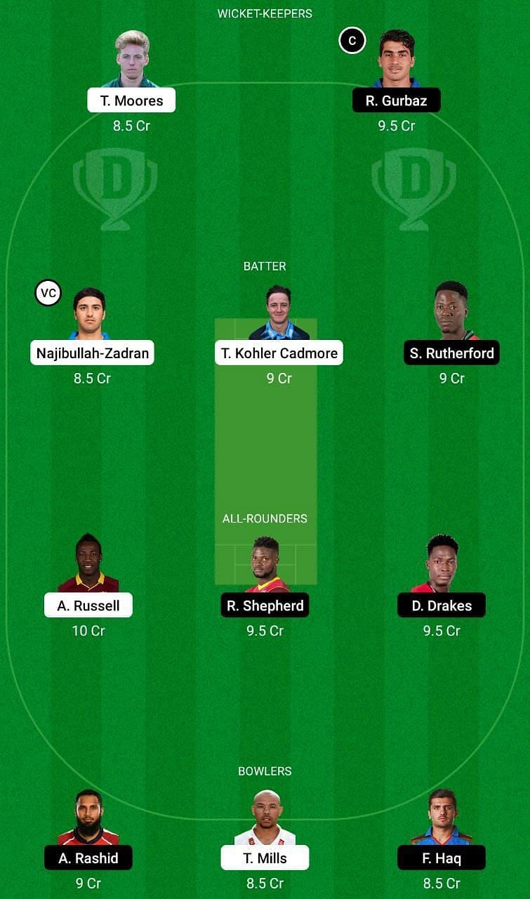 Fantasy Suggestion #2: Rahmanullah Gurbaz, Najibullah Zadran, Tom Kohler-Cadmore, Tom Moores, Andre Russell, Sherfane Rutherford, Romario Shepherd, Dominic Drakes, Tymal Mills, Fazalhaq Farooqi and Adil Rashid