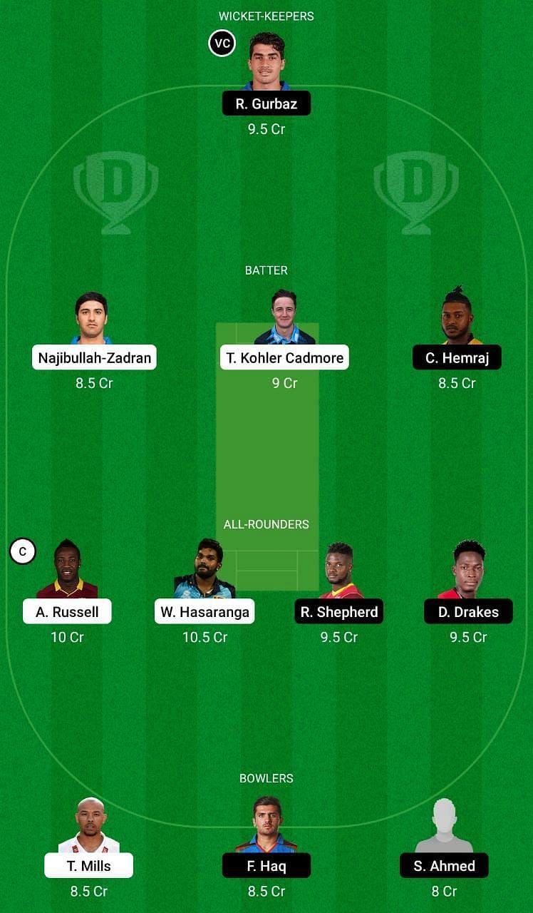 Fantasy Suggestion #1: Rahmanullah Gurbaz, Najibullah Zadran, Tom Kohler-Cadmore, Chandrapaul Hemraj, Andre Russell, Wanindu Hasaranga, Romario Shepherd, Dominic Drakes, Tymal Mills, Fazalhaq Farooqi and Shiraz Ahmed