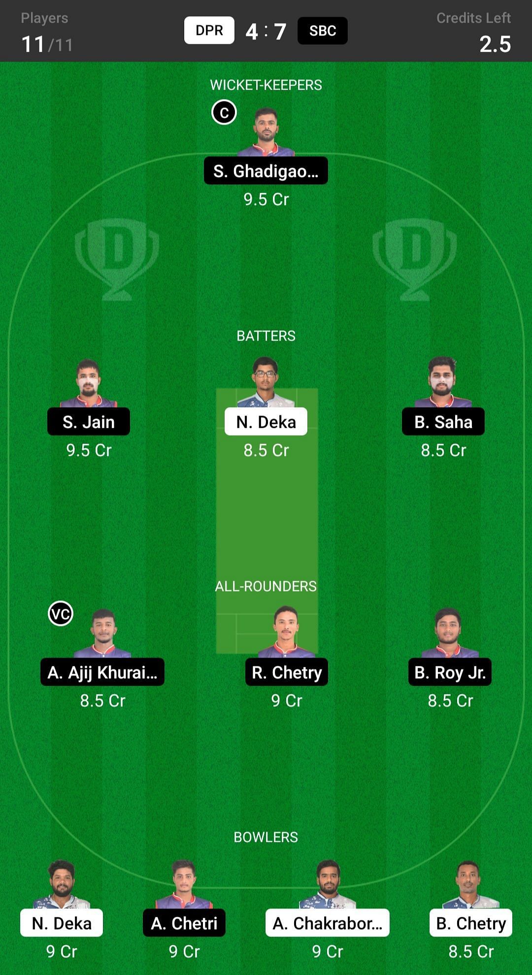 R Chetry and A Ajij are the best all-rounder picks for your Dream11 team, as they bat in the top order and also complete their quota of overs. B Roy is another good pick.