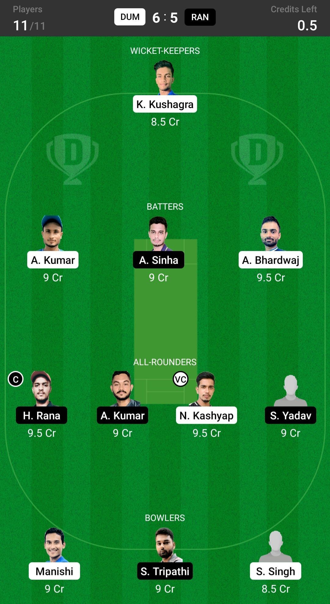 Fantasy suggestion #2: K Kushagra, Arvind Kumar, Ankit Kumar, A Sinha, A Bhardwaj, H Rana, Ayush Kumar, N Kashyap, Manishi, S Tripathi, U Mallick