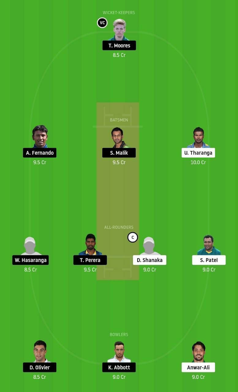 Fantasy Suggestion #1: T Moores, A Fernando, S Malik, U Tharanga, D Shanaka, S Patel, W Hasaranga, T Perera, D Olivier, A Ali and K Abbott