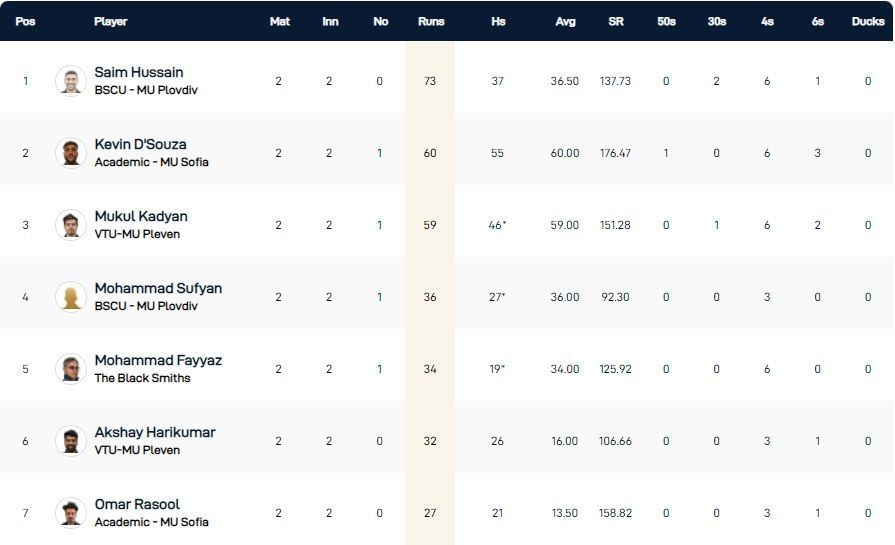 BSCU - MU Plovdiv's Saim Hussain is the highest run-scorer after the first day of action in the ECS Bulgaria T10 League 2022. He has amassed 73 runs in two matches, with a top score of 37. Hussain has a decent strike rate of 137.73 and has struck six fours and a solitary six.