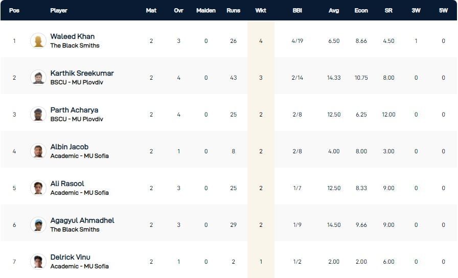 BSCU - MU Plovdiv's Karthik Sreekumar, who has dismissed three opposition batters, occupies second position on the wicket-taking charts. He has 2/14 as his best performance and has conceded an average of 10.75 runs per over.