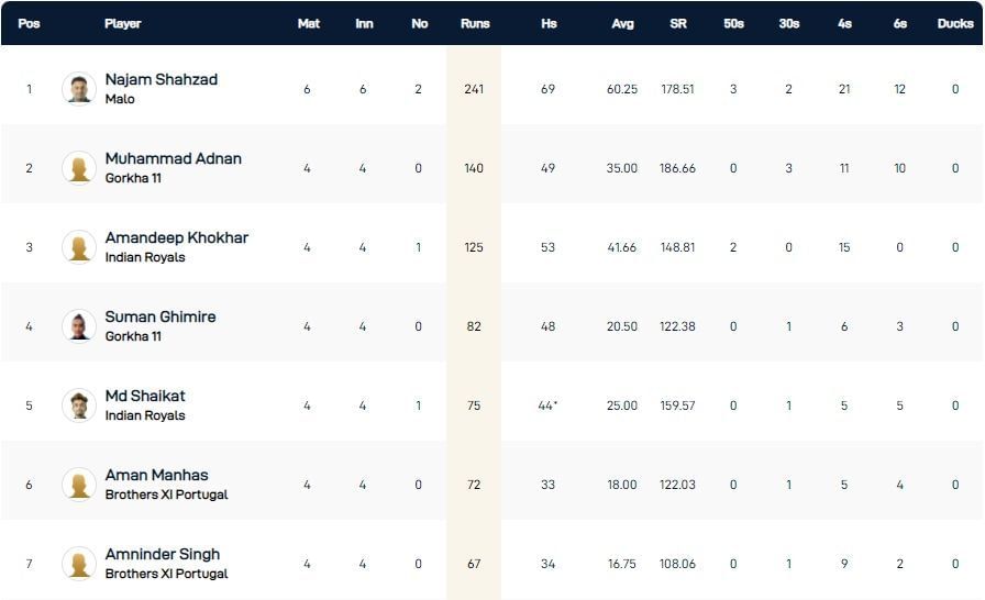 Apart from Adnan and Khokhar, Gorkha 11's Suman Ghimire (82), Indian Royals' Md Shaikat (75), Brothers XI Portugal's Aman Manhas (72), Amninder Singh (67) and Balwinder Singh (66), and Fighters CC's Jaswinder Kumar (66), Ravinder Singh (61) and Parwinder Singh (61) are the highest run-scorers of their respective sides.
