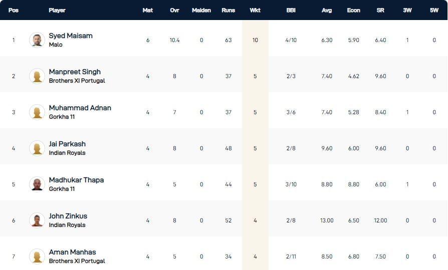 Brothers XI Portugal's Manpreet Singh and Gorkha 11's Muhammad Adnan are among four bowlers who have picked up five wickets apiece in the tournament thus far. They are placed second and third on the wicket-taking charts by virtue of being more economical than the other two bowlers.