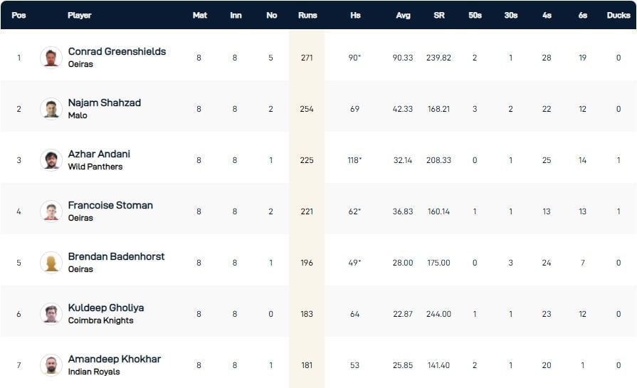 Oeiras' Conrad Greenshields has emerged as the highest run-scorer after the group stage of the ECS Cartaxo T10 League 2022. He has blasted 271 runs in eight matches, with a top score of an unbeaten 90. Greenshields' runs have come at an outstanding strike rate of 239.82 and are studded with 28 fours and 19 sixes.