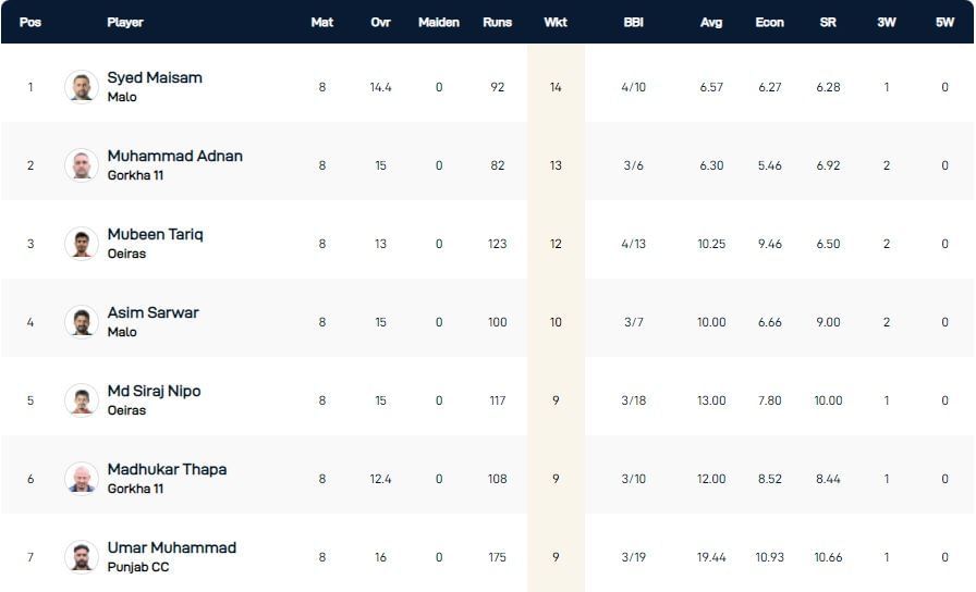 Gorkha 11's Muhammad Adnan, who has accounted for 13 dismissals, occupies second position on the wicket-taking charts. He has 3/6 as his best effort and has conceded an average of just 5.46 runs per over.
