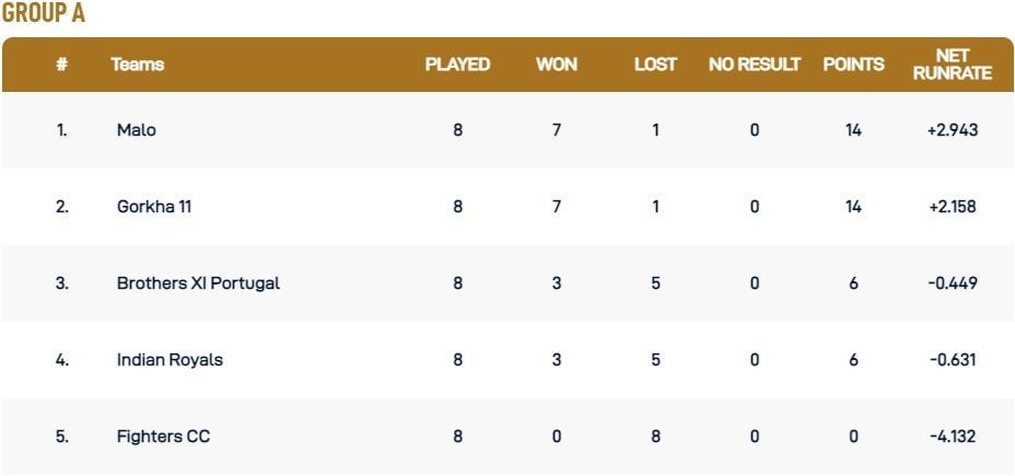Oeiras finished atop the Group B points table of the Cartaxo T10 League 2022, with 14 points to their credit. They are followed by Punjab CC, who garnered 10 points in the league phase.