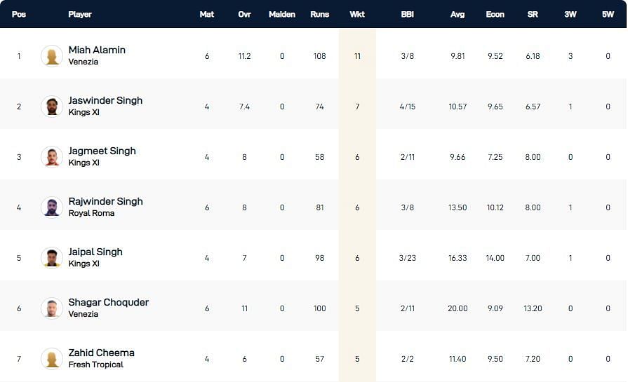 Venezia's Miah Alamin, with 11 scalps to his name, has consolidated his position as the highest wicket-taker after Day 3 of the Italy T10 Super Series 2021. He has 3/8 as his best performance and has conceded an average of 9.52 runs per over.