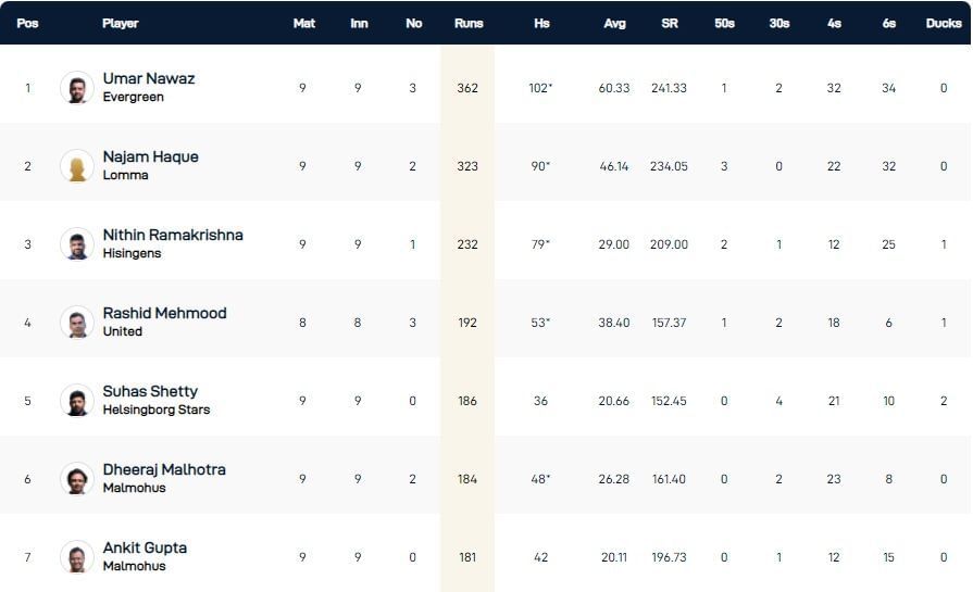 Apart from Nawaz, Malmohus' Dheeraj Malhotra (184), Ankit Gupta (181), Sandeep Mallidi (160) and Sambit Pattanaik (152) have also been among the runs. Jonkoping's Riaz Khan (158), Naser Batcha (135) and Sami Ibrahimkhil (125) as well as Ariana CC's Qader Sadat (150), Nusratullah Sultan (133) and Mahmood Babar (93) are the top-scorers for their respective sides.
