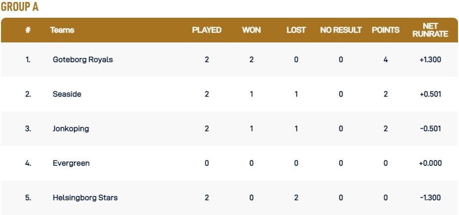 Seaside and Jonkoping follow the table-toppers in the Group A standings. Both sides have two points, having won and lost a match apiece, with the former having a better net run rate.