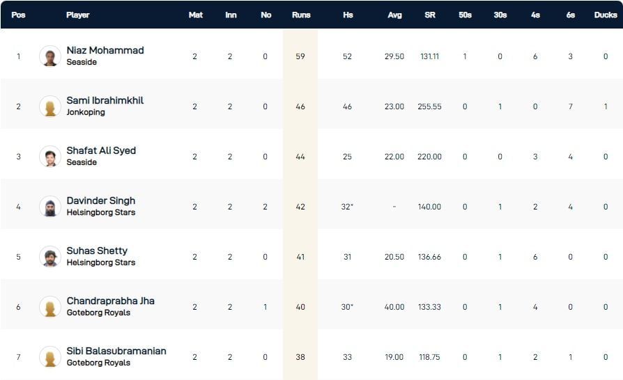 Seaside's Niaz Mohammad is the highest run-scorer after the first day of action in the ECS Landskrona T10 League 2022. He has amassed 59 runs in two matches, with his 52 being the only half-century of the tournament thus far. Mohammad has a decent strike rate of 131.11 and has struck six fours and three sixes.