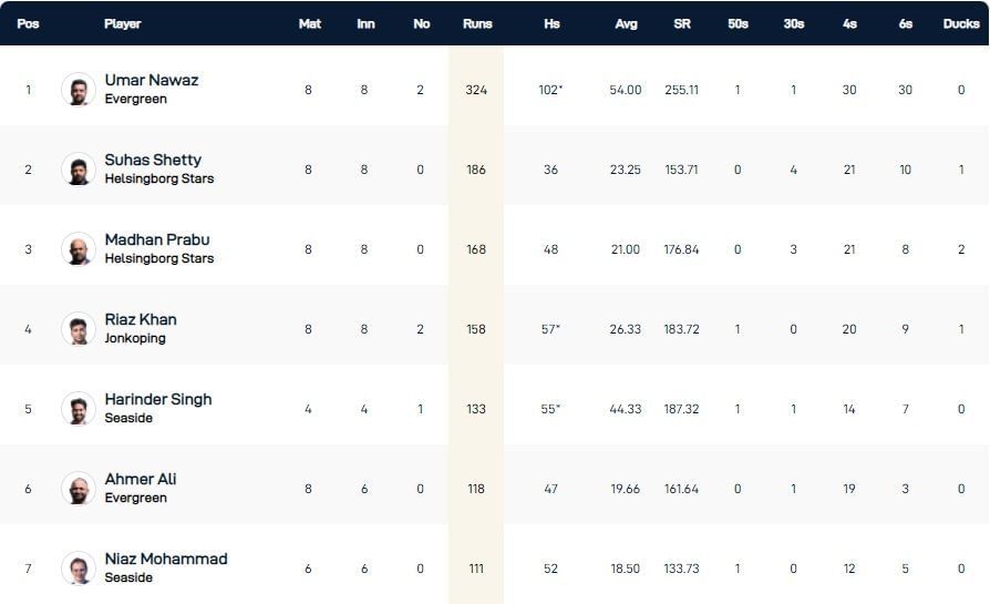 Helsingborg Stars' Suhas Shetty is placed second in the run-scoring charts. He has aggregated 186 runs thus far, with 36 being his best effort. Shetty has scored his runs at an impressive strike rate of 153.71, with the help of 21 fours and 10 maximums.