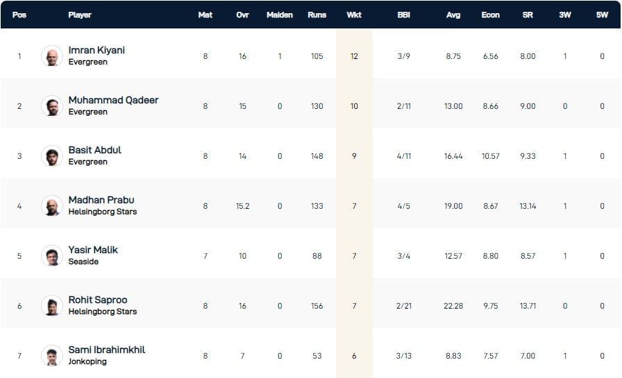Evergreen's Imran Kiyani, with 12 scalps to his name, is still the highest wicket-taker after Day 6 of the Landskrona T10 League 2022. He has 3/9 as his best performance and has an impressive economy rate of 6.56.