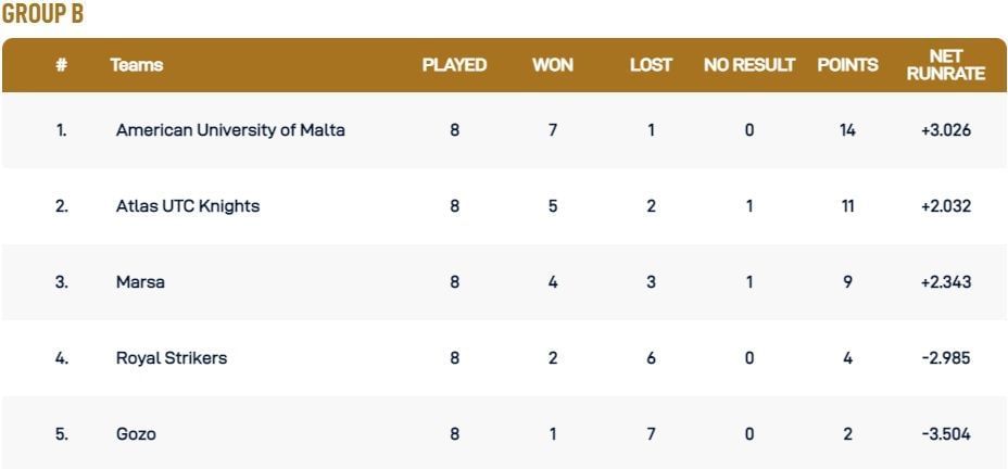 American University of Malta finished atop the Group B points table of the Malta T10 League 2021. They suffered just one defeat in the league phase and have 14 points in their kitty.