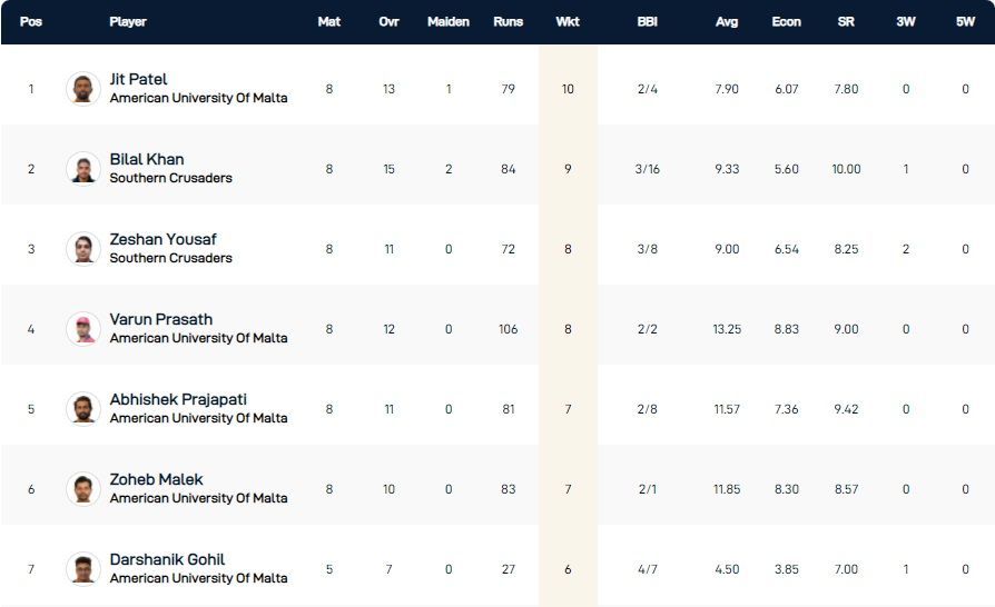 Southern Crusaders' Zeshan Yousaf and American University of Malta's Varun Prasath have both picked up eight wickets in the Malta T10 League 2021 so far. Yousaf, who has 3/8 as his best performance, has conceded an average of just 6.54 runs per over.