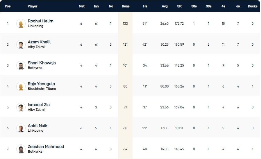 Linkoping's Roohul Halim has emerged as the highest run-scorer after the third day of action in the ECS Stockholm T10 League 2022. He has amassed 133 runs in six matches, with a top score of an unbeaten 51. Halim has scored his runs at an impressive strike rate of 172.72, with the help of 15 fours and seven sixes.
