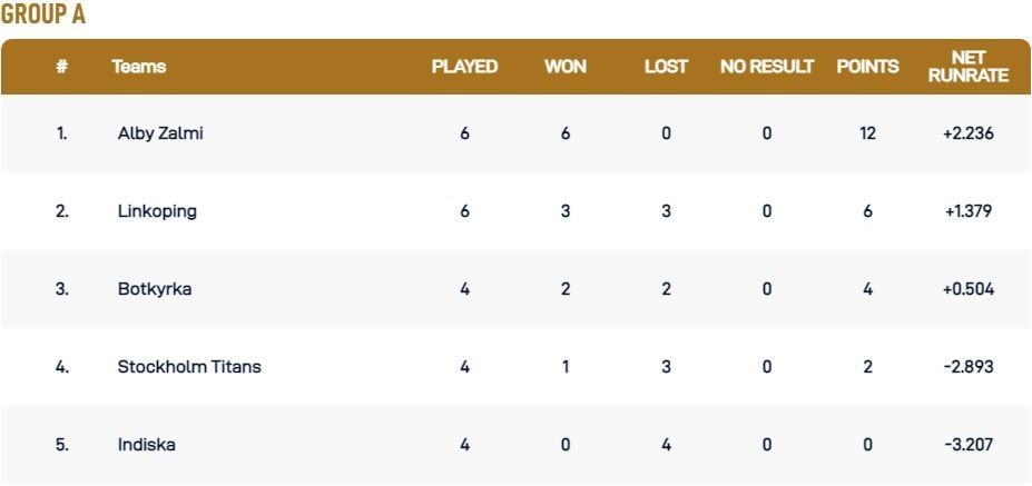 Alby Zalmi continue to occupy the top spot in the Group A points table of the Stockholm T10 League 2022. They have emerged victorious in all six of their matches thus far and have 12 points to their name.