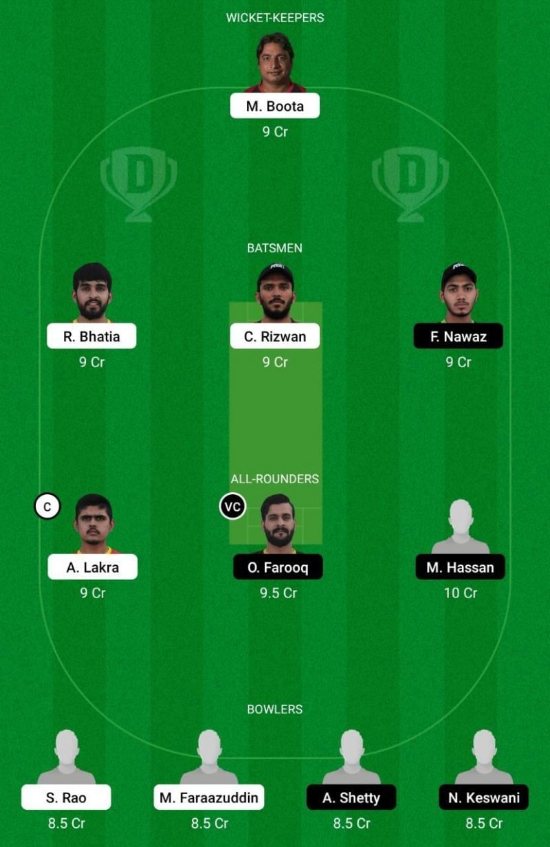 Fantasy Suggestion #1: Muhammad Boota, CP Rizwan, Fahad Nawaz, Rahul Bhatia, Aryan Lakra, Muhammad Hassan, Omer Farooq, Adhithya Shetty, Mohammed Faraazuddin, Nilansh Keswani, Sabir Rao.