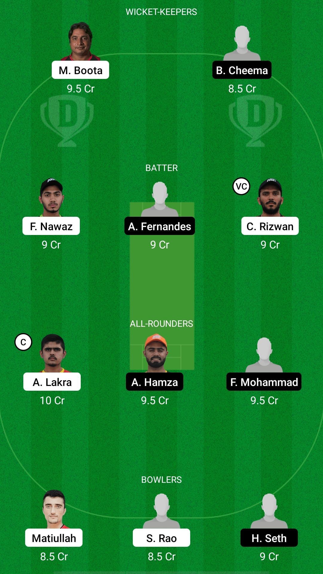 Captain: Ameer Hamza. Vice-captain: Aryan Lakra.