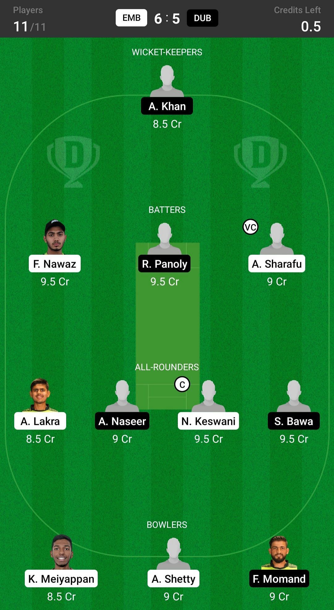 Fantasy suggestion #1: A Khan, F Nawaz, R Panoly, A Sharafu, Z Farid, A Lakra, N Keswani, S Bawa, A Shetty, L Meiyappan, and F Momand