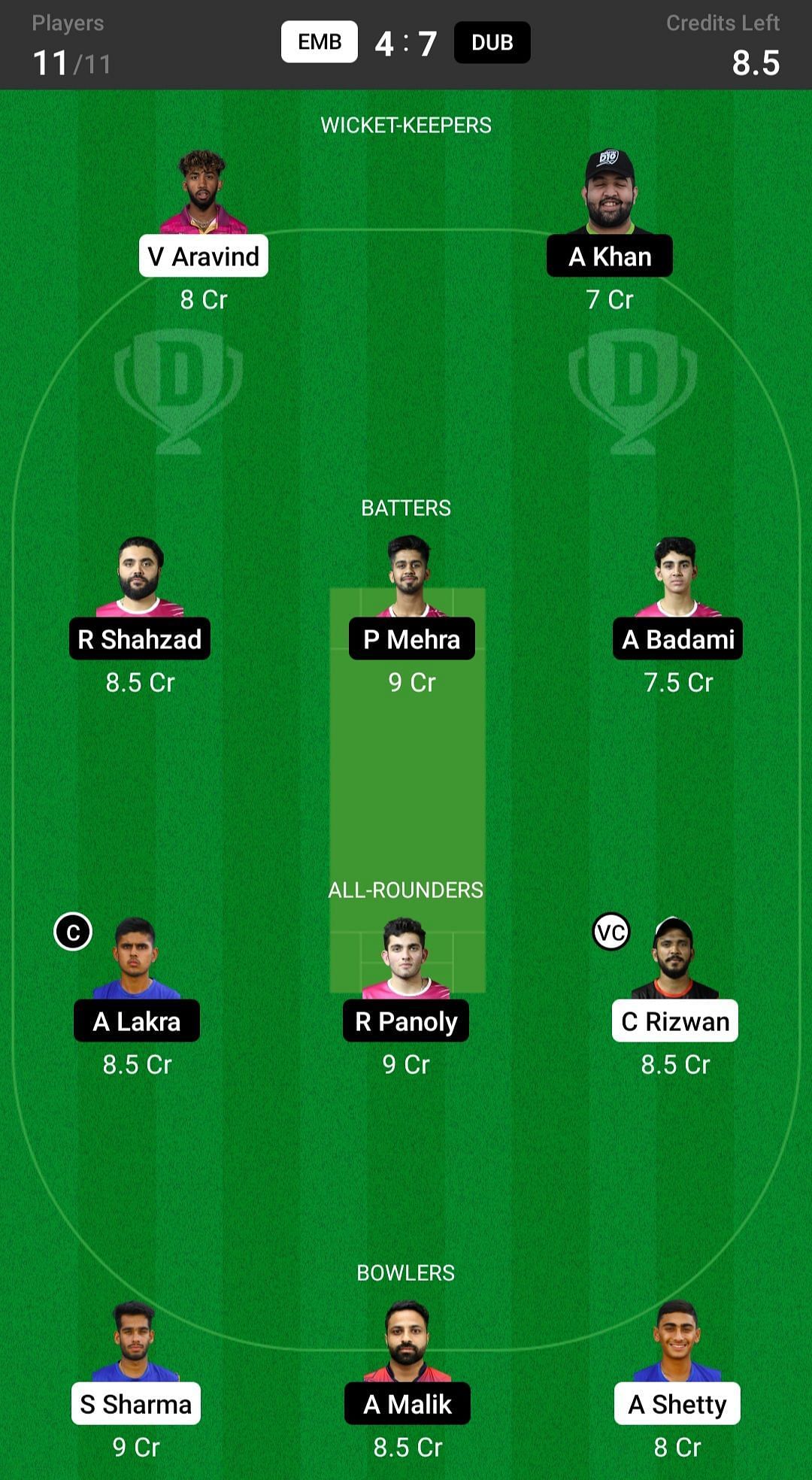 R Shehzad and P Mehra are the two best batsmen picks for the Dream11 team. A Sharafu has played exceptionally well in the last few matches, so he is also a good pick for today's Dream11 team.