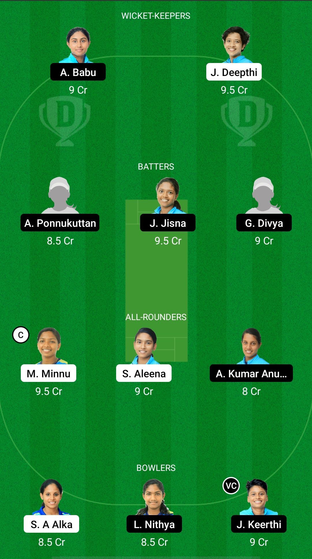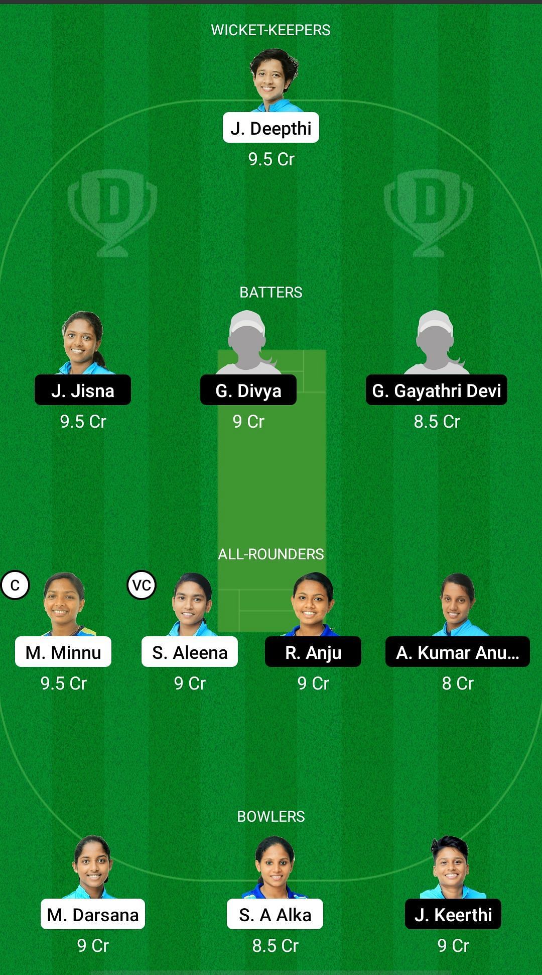 Fantasy Suggestion #2: JS Deephti, Jisna Joseph, Divya Ganesh, Gopika Gayathri Devi, Mani Minnu, Aleena Surendran, Anju Rajan, Anusree Anilkumar, Darsana Mohanan, Alka A Suresh-I, Keerthi James.