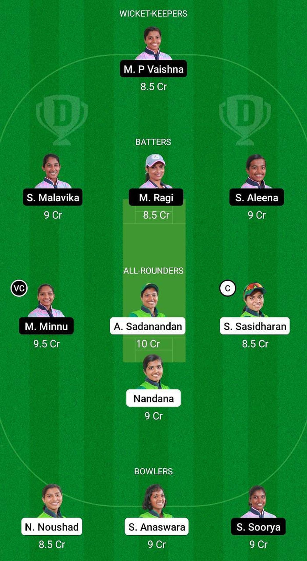 Minnu Mani (c), Alka A Suresh, Vaishna M P (wk), Malavika Sabu, Aleena M P, Arya Baby, Aleena Shibu, Soorya Sukumar, Ragi Mohan, Sneha K R, Vinaya Surendran