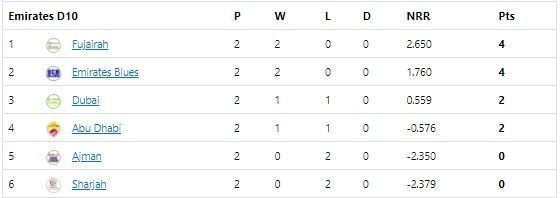 Fujairah and Emirates Blues occupy the top two spots in the Emirates D10 League 2021 points table. Both sides have four points, with the former placed higher due to their better net run rate.