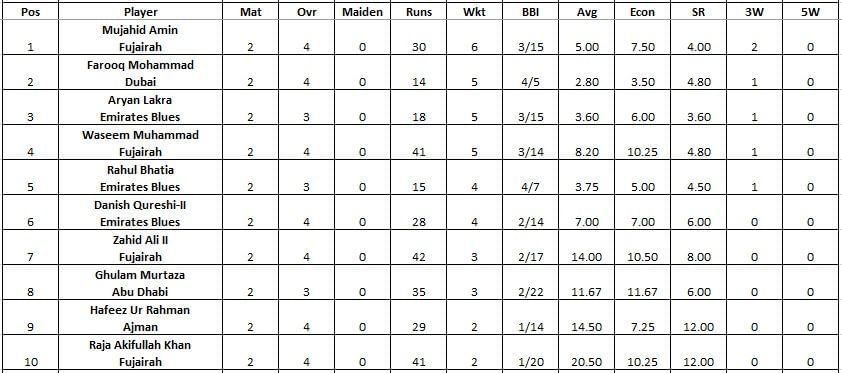Fujairah's Mujahid Amin, with six scalps to his credit, has emerged as the highest wicket-taker after Day 2 of the Emirates D10 League 2021. He has 3/15 as his best performance and has a decent economy of 7.50.