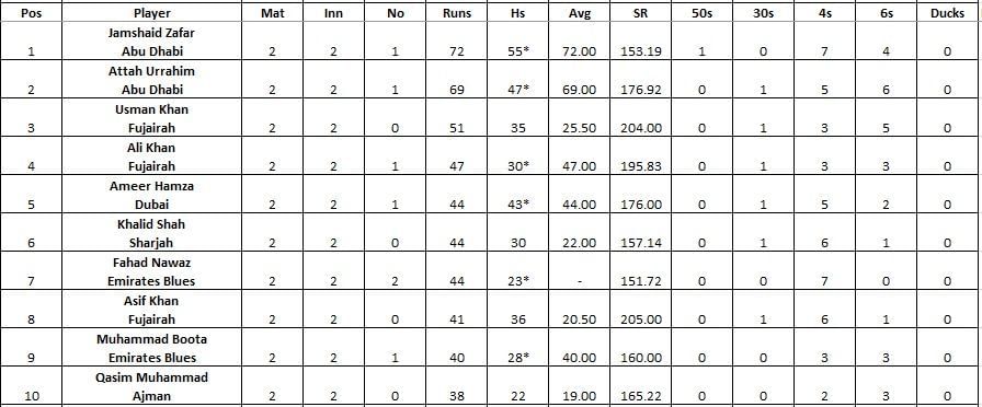 Abu Dhabi's Jamshaid Zafar continues to be the highest run-scorer after the second day of action in the Emirates D10 League 2021. He has aggregated 72 runs in two matches, with his unbeaten 55 being the only half-century of the tournament so far. Zafar's runs have come at a decent strike rate of 153.19 and are studded with seven fours and four sixes.