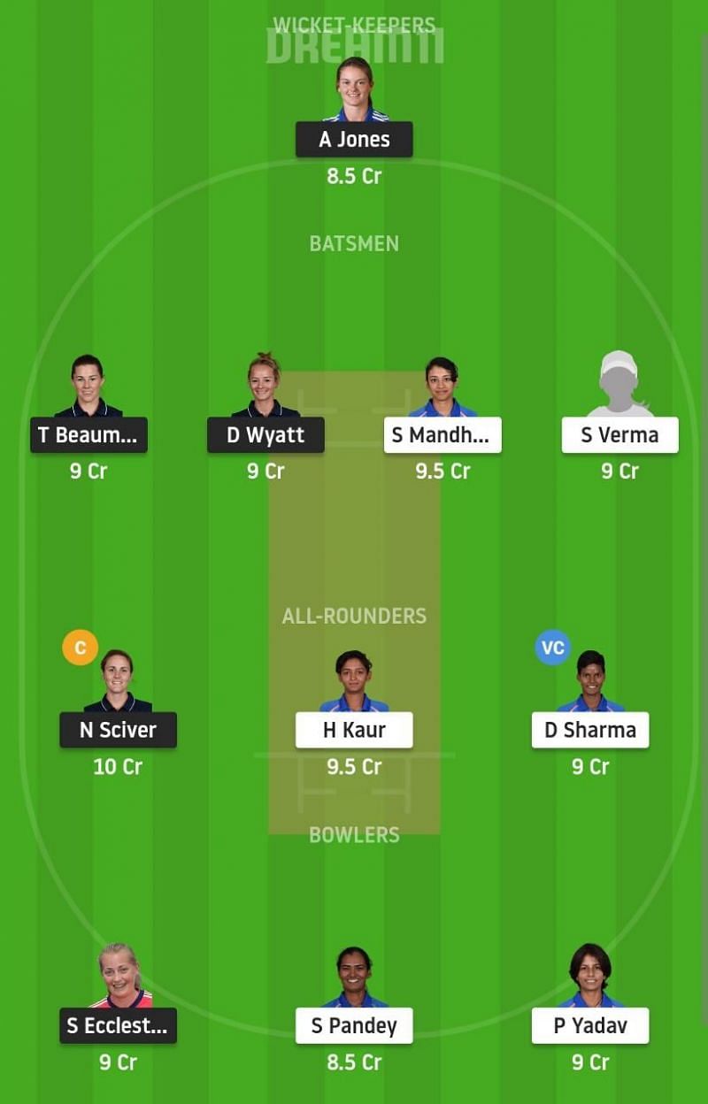 Fantasy Suggestion #1: Annabel Jones, Tammy Beaumont, Danni Wyatt, Smriti Mandhana, Shafali Verma, Nat Sciver, Harmanpreet Kaur, Deepti Sharma, Sophie Ecclestone, Shikha Pandey, Poonam Yadav