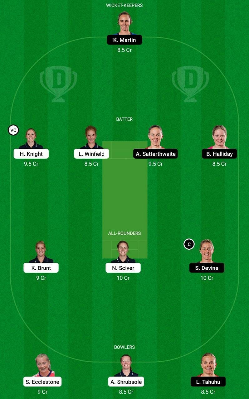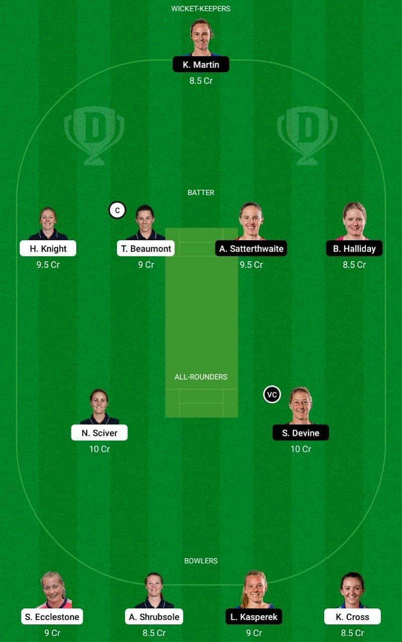 Fantasy Suggestion #1: Katey Martin, Amy Sattherthwaite, Brooke Halliday, Heather Knight, Tammy Beaumont, Natalie Sciver, Sophie Devine, Anya Shrubsole, Kate Cross, Leigh Kasperek and Sophie Ecclestone