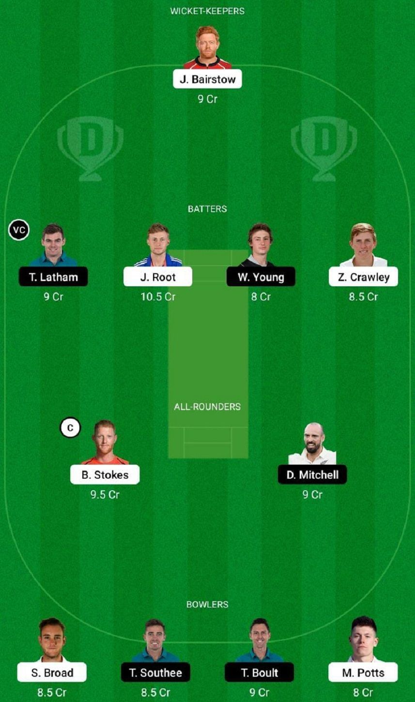 Fantasy Suggestion #1: Jonny Bairstow, Tom Latham, Joe Root, Will Young, Zak Crawley, Ben Stokes, Daryl Mitchell, Stuart Broad, Tim Southee, Trent Boult and Matty Potts.
