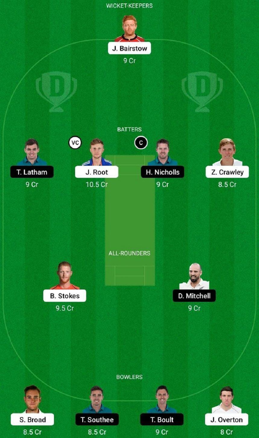 Fantasy Suggestion #2: Jonny Bairstow, Tom Latham, Joe Root, Henry Nicholls, Zak Crawley, Ben Stokes, Daryl Mitchell, Stuart Broad, Tim Southee, Trent Boult and Jamie Overton.