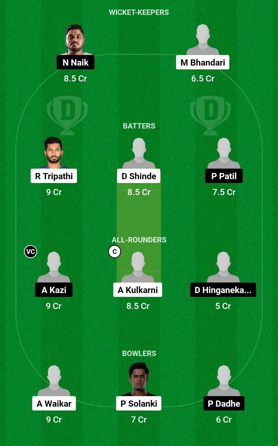 Eagle Nashik Titans Probable Playing XI: Harshad Khadiwale, Arshin Kulkarni, Rahul Tripathi (c), Dhanraj Shinde, Kaushal Tambe, Kaushal Tambe, Mandar Bhandari (wk), Akshay Kalokhe, Izhaan Sayed, Prashant Solanki, Akshay Waikar, and Samadhan Pagare.