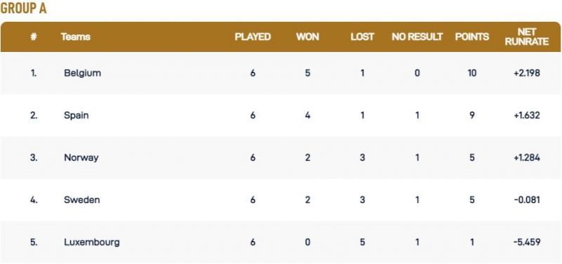 Belgium continue to be perched atop the Group A points table of the European Cricket Championship 2021 with ten points to their name. They are followed by Spain, who have nine points in their kitty.