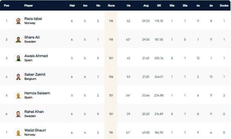 Norway's Raza Iqbal and Sweden's Share Ali are the joint-highest run-scorers after the third day of action in the European Cricket Championship 2021. Both players have amassed 118 runs so far, with the former having a better average.