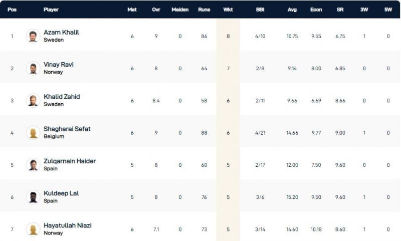 Norway's Vinay Ravi, who has dismissed seven opposition batsmen, occupies second spot on the wicket-taking charts. He has 2/8 as his best performance and has a decent economy of 8.00.
