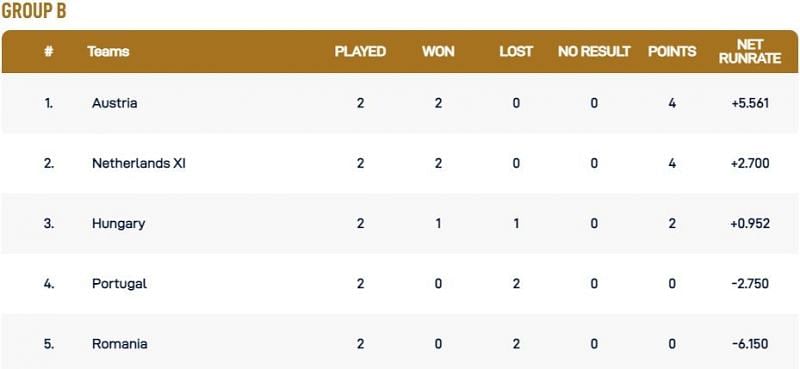 Austria and Netherlands XI occupy the top two spots in the Group B points table of the European Cricket Championship 2021. Both sides have four points, with the former having a better net run rate.