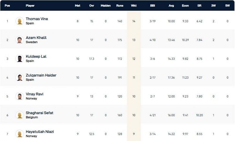 Sweden's Azam Khalil, who dismissed 13 opposition batsmen, occupies second position on the wicket-taking charts. He had 4/10 as his best effort and was taken for an average of 10.29 runs per over.